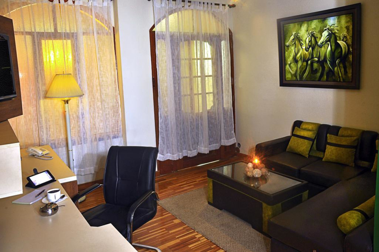 Гостям этого люкса предоставляется право посещения представительского лаунджа. В числе удобств — гидромассажная ванна и диван