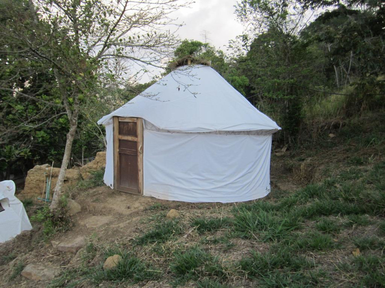 Полностью водонепроницаемая юрта с двуспальной кроватью, Wi-Fi, лампой, электричеством и стулом. Из юрты открывается красивый вид на сад и долину