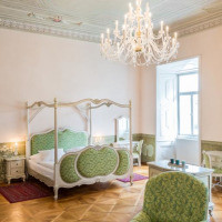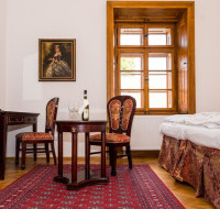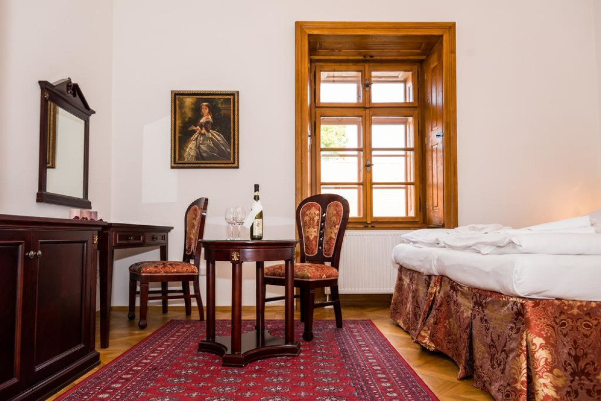 Очень просторные номера имеют обеденный стол и гостиную зону с диваном. Стены и потолок декорированы в традиционном стиле. Из окон открывается потрясающий вид на замковый парк. В ванной комнате установлена отдельно стоящая ванна