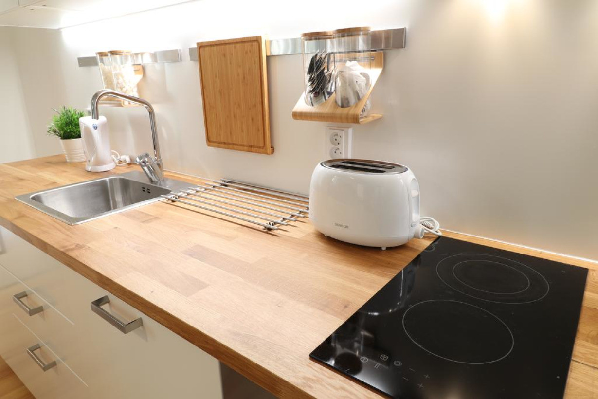 Апартаменты с обеденной зоной, кухонными принадлежностями и стиральной машиной