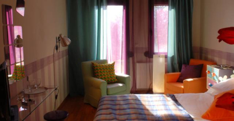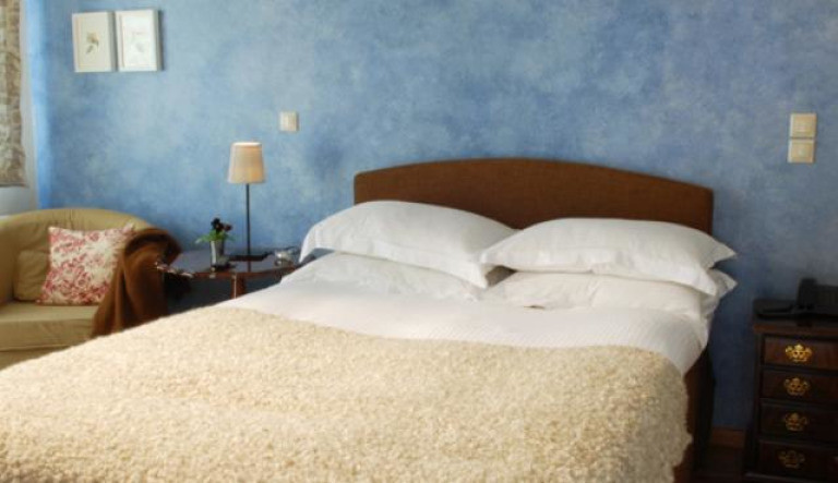 Оформленный в теплых тонах номер с гостиной зоной с камином, полом из древесины каштана, постельным бельем фирмы Cocomat, балконом с видом на коринфские хвойные деревья, ЖК-телевизором, DVD-плеером и фирменными туалетно-косметическими принадлежностями