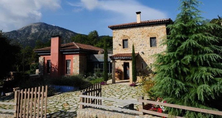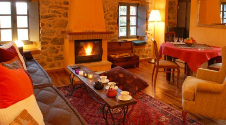 Люкс с отдельной спальней с камином, гостиной с каменными стенами и вторым камином, балконом с видом на коринфские хвойные деревья, 2 ЖК-телевизорами, DVD-плеером, постельным бельем фирмы Cocomat и фирменными туалетно-косметическими принадлежностями
