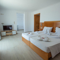 Люкс на верхнем этаже с просторной террасой, с которой открывается вид на море. В числе удобств мини-кухня с холодильником и электрическим чайником