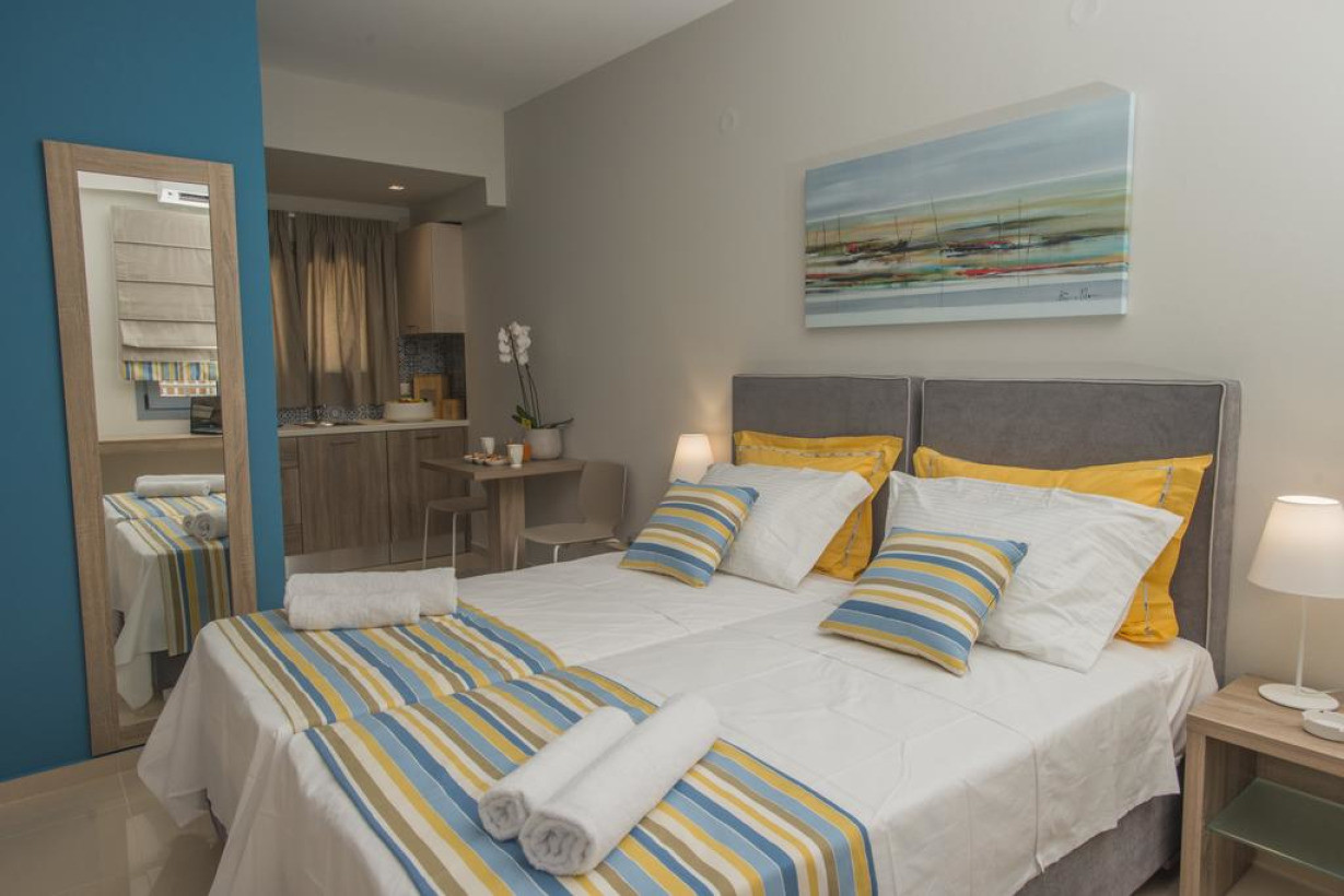 Номер-студио находится в передней части здания с видом на Ливийское море. На полностью оборудованной кухне в распоряжении гостей обеденная зона
