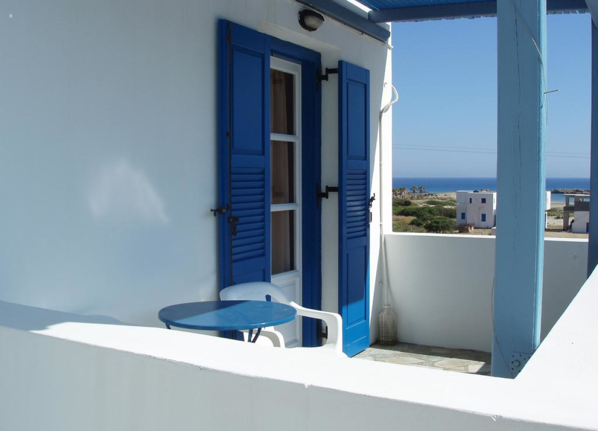 Просторный номер с кондиционером и выходом на затененный балкон, с которого открывается вид на Эгейское море. К услугам гостей телевизор и холодильник