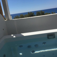 Из этого номера в кикладском стиле открывается вид на Эгейское море. В числе удобств кованая кровать, собственный балкон и спутниковое телевидение