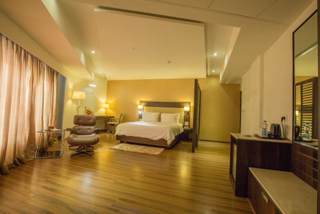 Строго оформленный номер с видом на газон, кондиционером, гостиным уголком и кабельным телевидением. Установлен электрический чайник. В собственных ванных комнатах установлен душ. В числе прочих удобств — письменный стол и сейф. Номер отличается более просторной планировкой