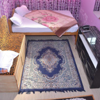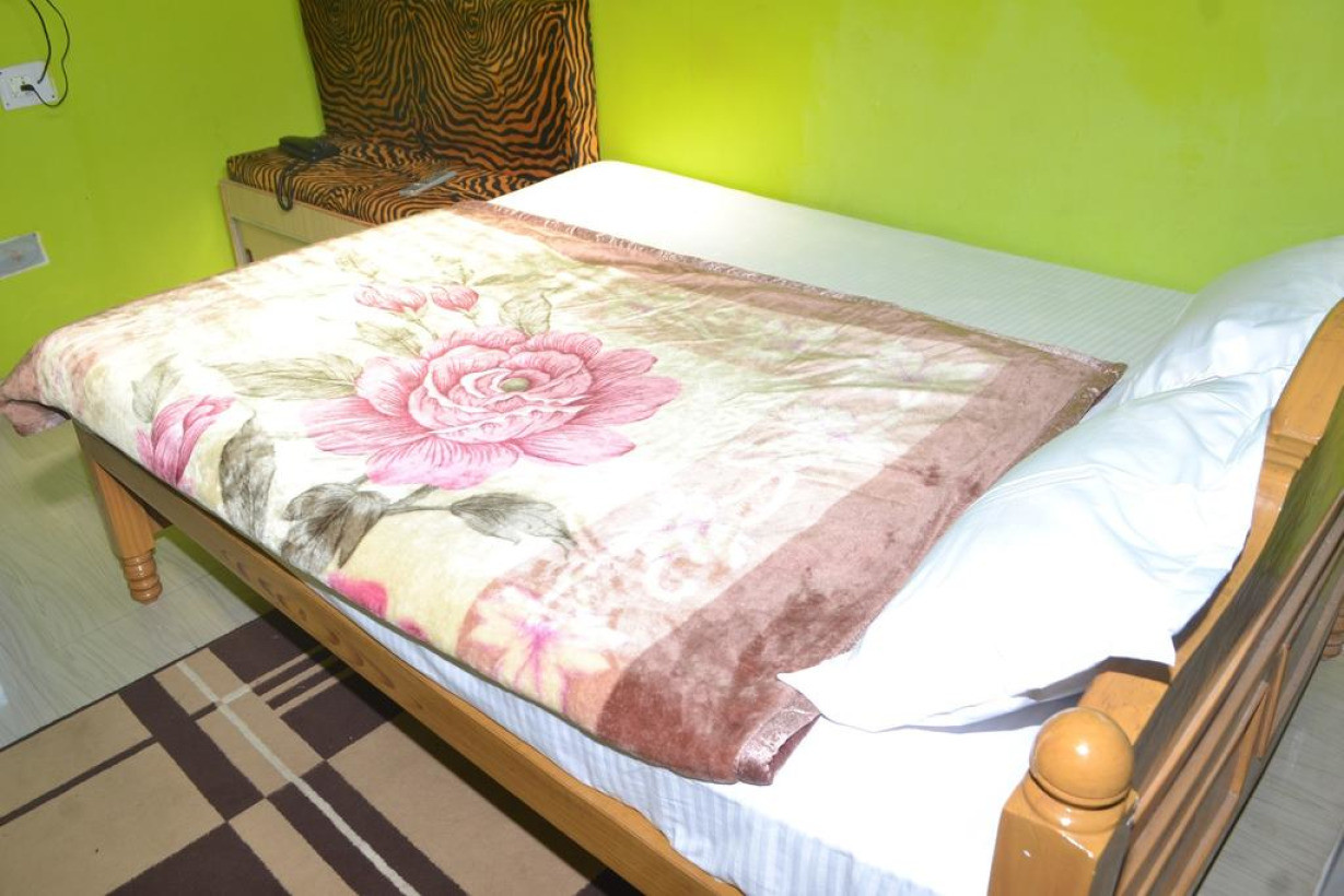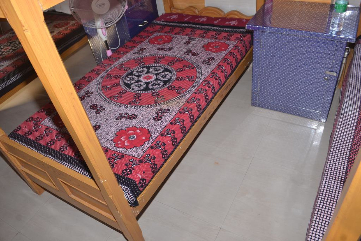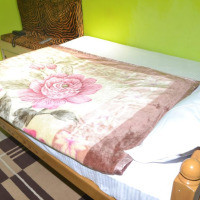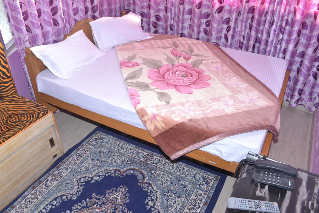 Кровать в общем номере с кондиционером и отдельным входом. Пол выложен плиткой/мрамором