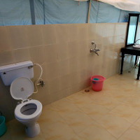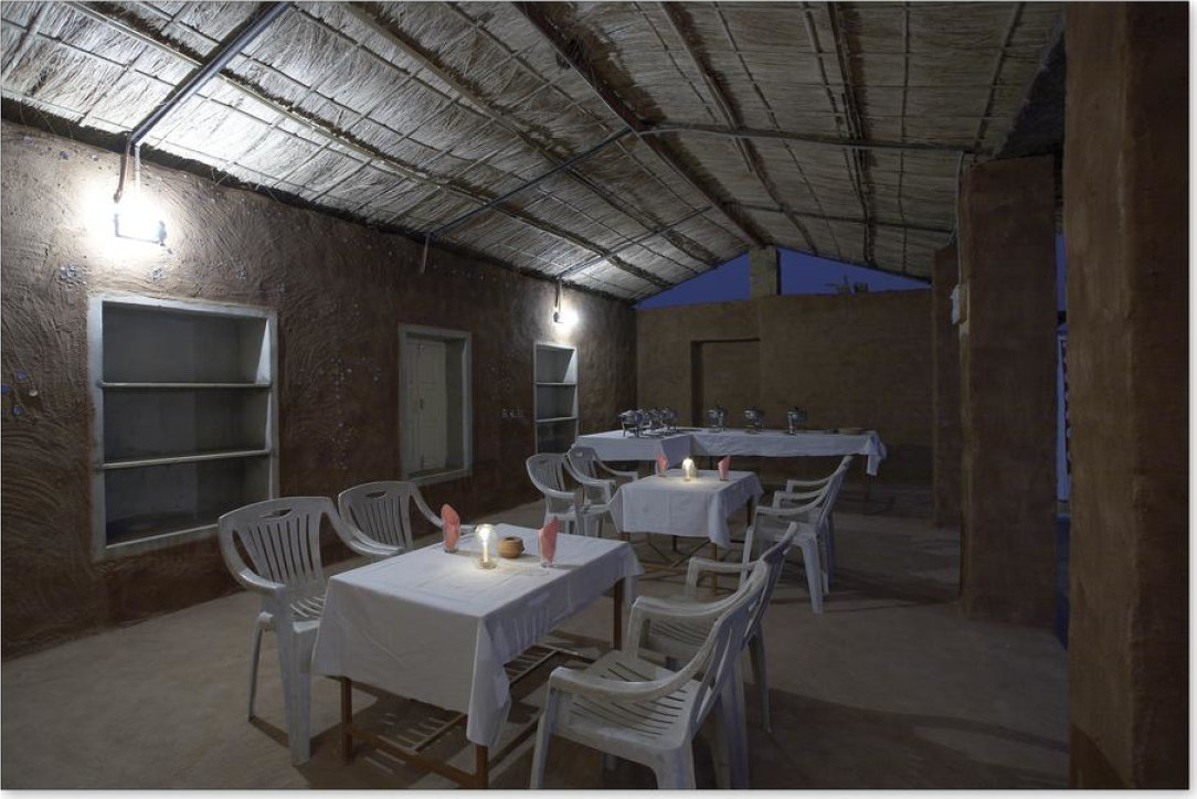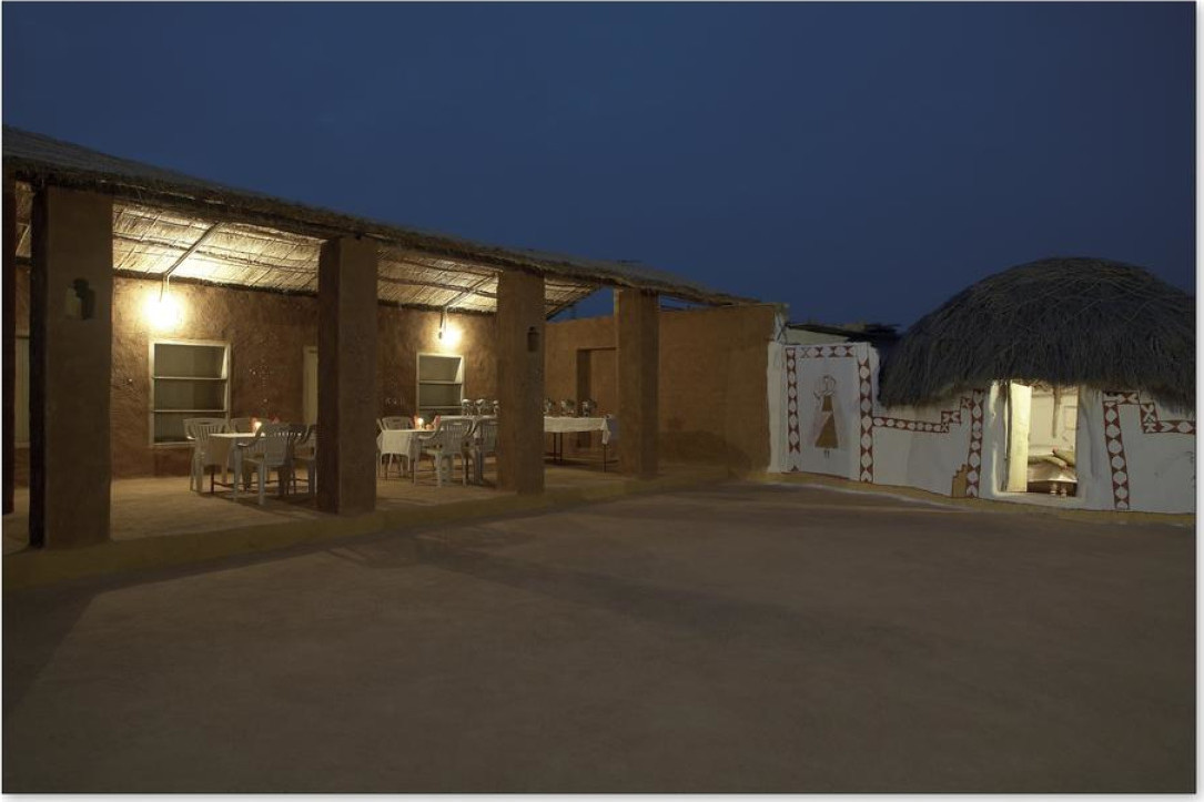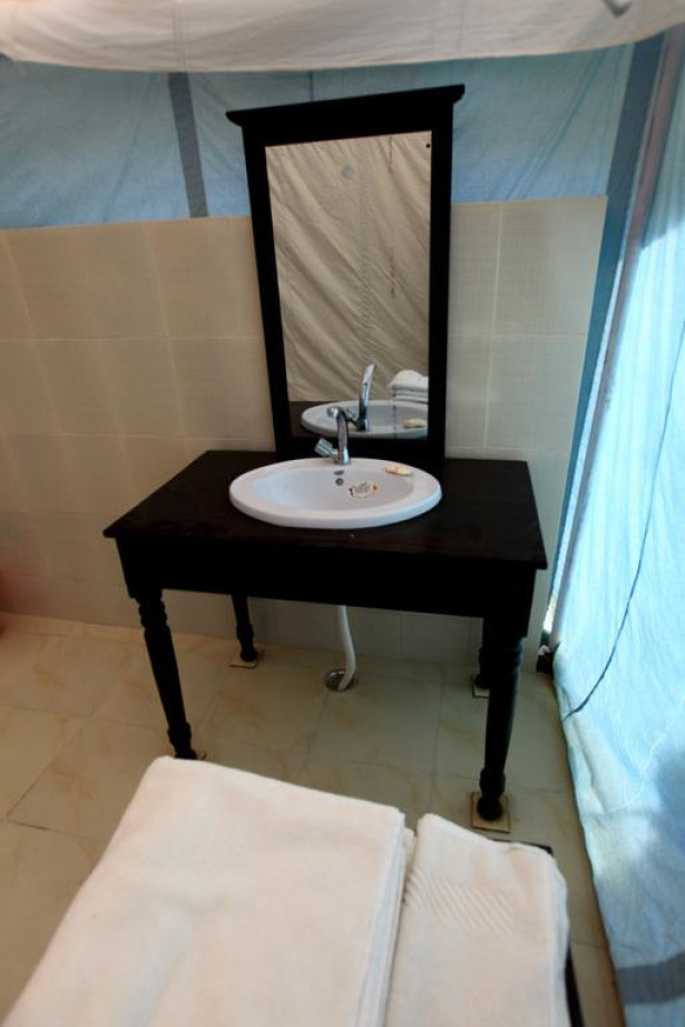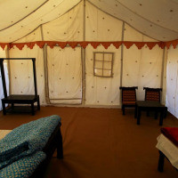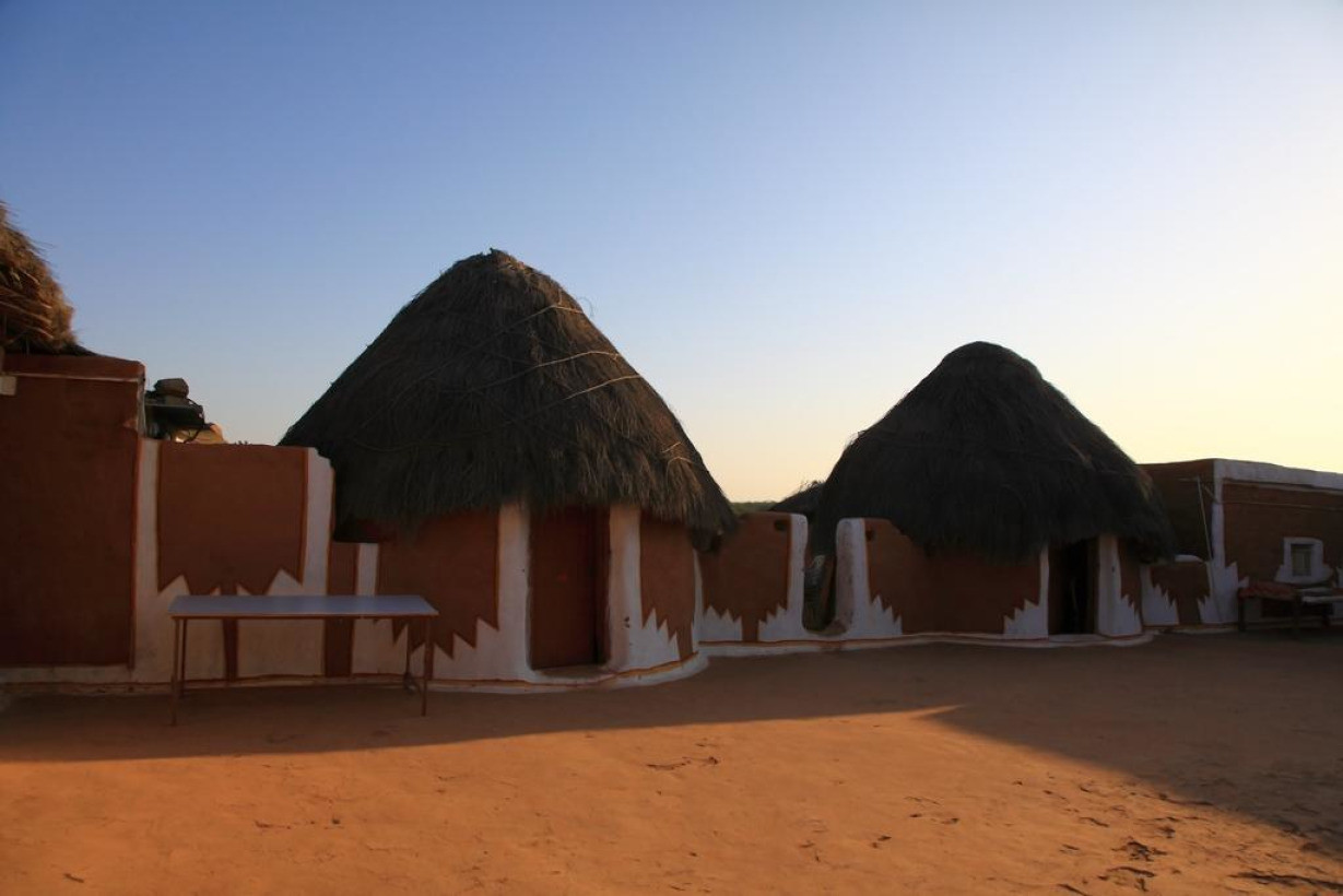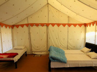 Уникальный коттедж из прочного брезента, натянутого на железный каркас, с раздвигающимися окнами и дверью. В числе удобств — вентилятор и собственная ванная комната западного стандарта. В стоимость проживания входит сафари-экскурсия на верблюдах