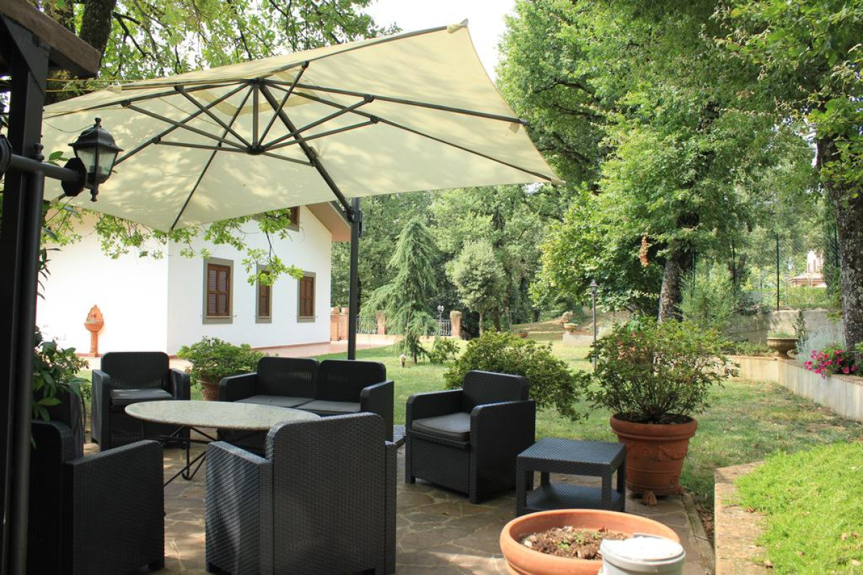 Номер с деревянными потолочными балками. В числе удобств — собственная ванная комната и телевизор. Из окон открывается вид на окружающие горы и собственный парк