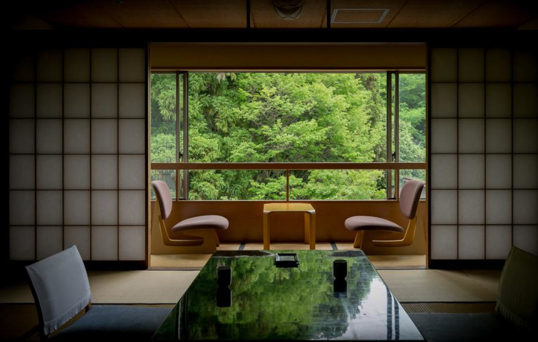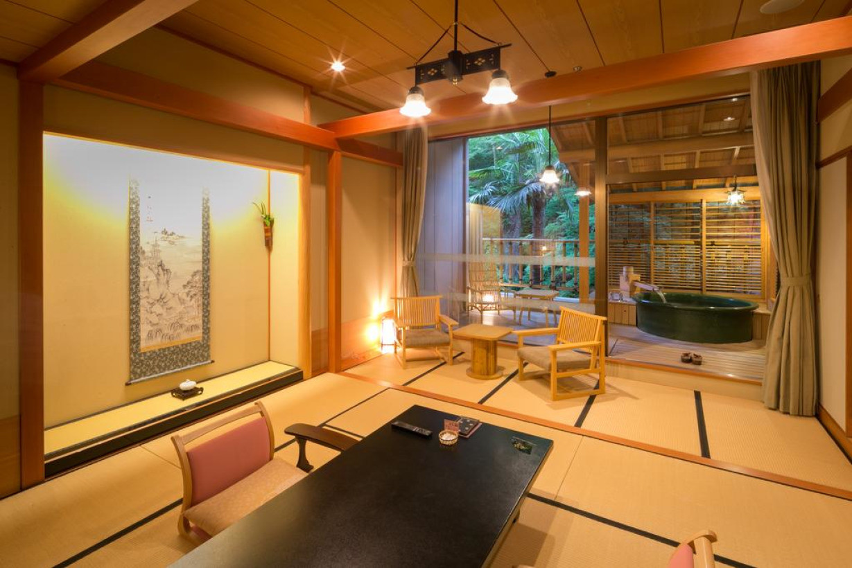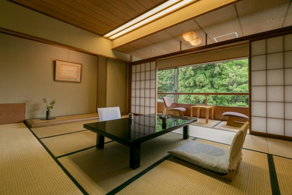 Номер располагает кондиционером, полом с татами (соломенной циновкой), японским футоном-матрасом, сейфом, холодильником и электрическим чайником с пакетированным зеленым чаем. В ванной комнате предоставляется фен