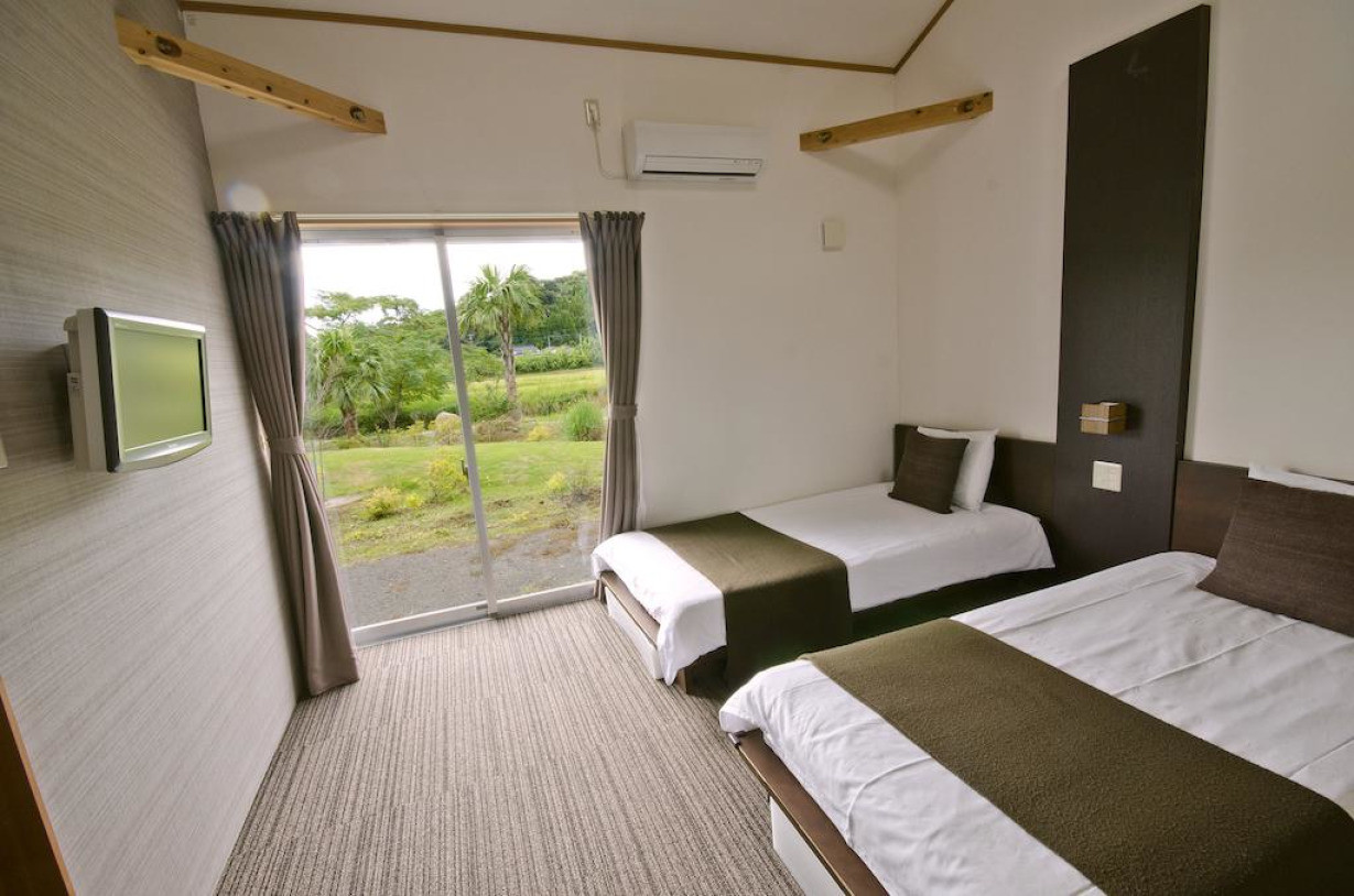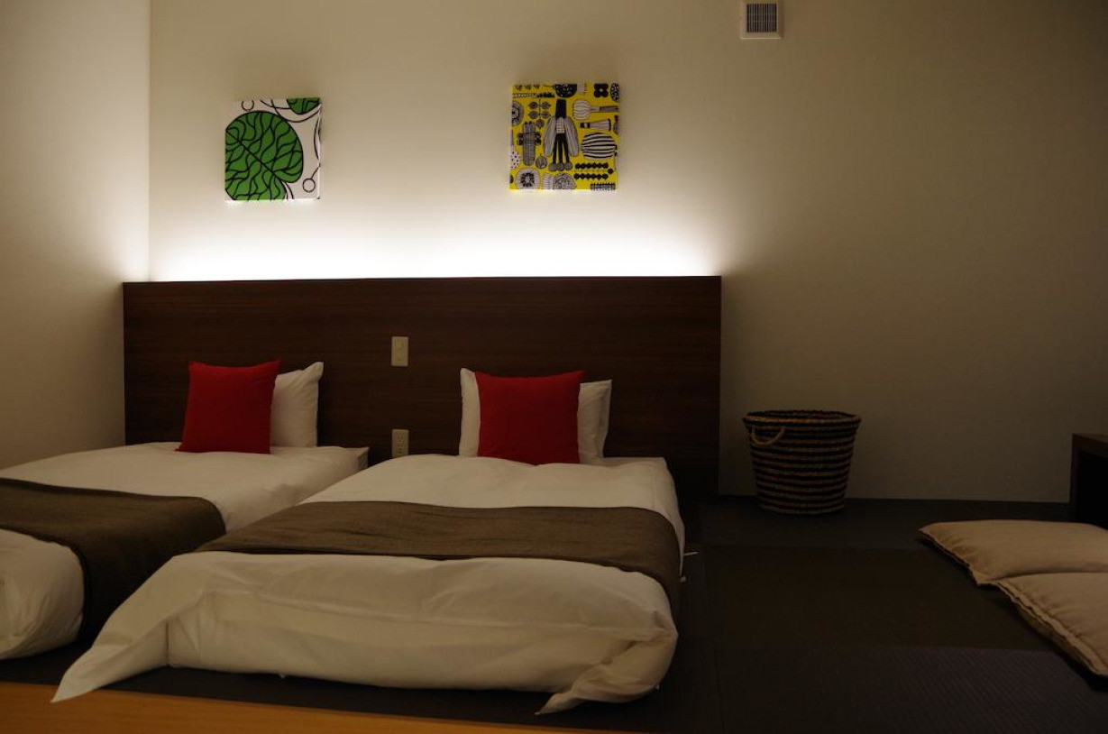 Номер с кроватями в западном стиле и матрасами-футонами на татами. Номера располагают кондиционером, телевизором с плоским экраном, холодильником и электрическим чайником. В ванной комнате установлена термальная ванна, а также предоставляются фен и бесплатные туалетно-косметические принадлежности