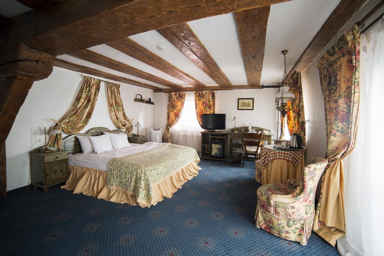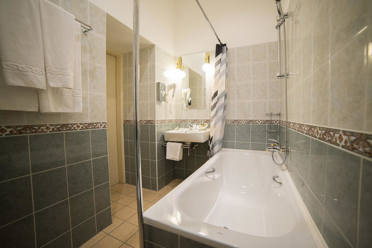 Очень просторный одноместный люкс обставлен старинной мебелью. В ванной комнате с ванной или душем предоставляется фен и органическая косметика