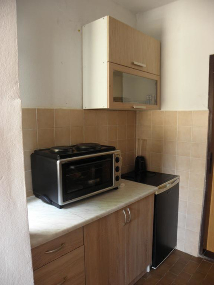 Апартаменты с кухней и кухонными принадлежностями. Из окон открывается вид на сад