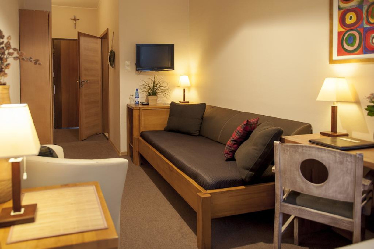 Элегантный, светлый номер, обставленный деревянной мебелью в теплых тонах. В распоряжении гостей телевизор с кабельными каналами и собственная ванная комната с туалетно-косметическими принадлежностями. В числе удобств – гостиная зона