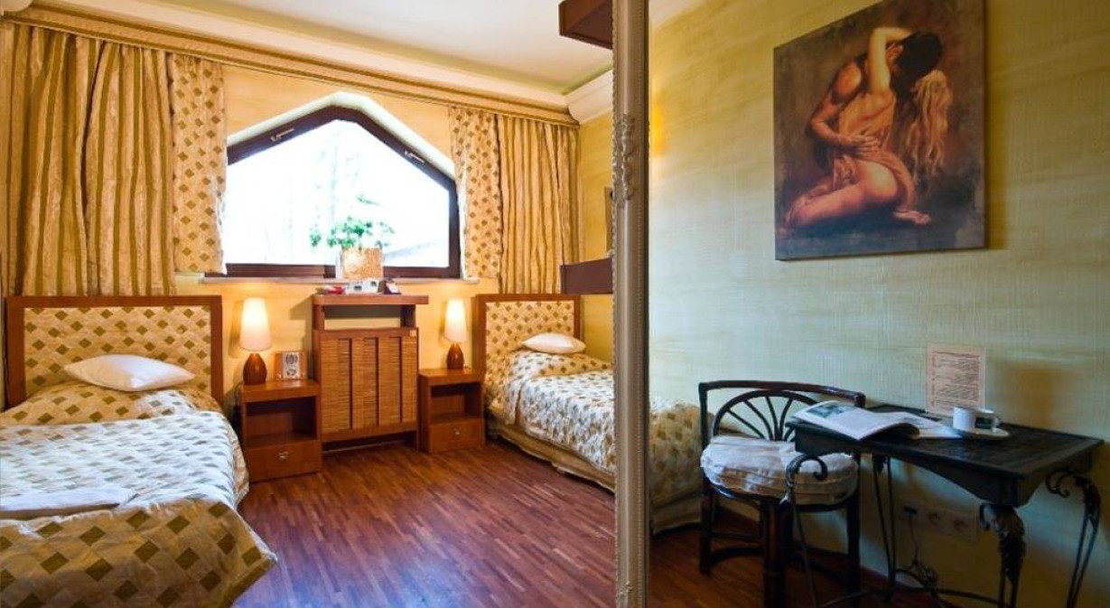 Номер оформлен в загородном стиле с использованием фрагментов оригинальных потолочных балок. К услугам гостей телевизор и ванная комната