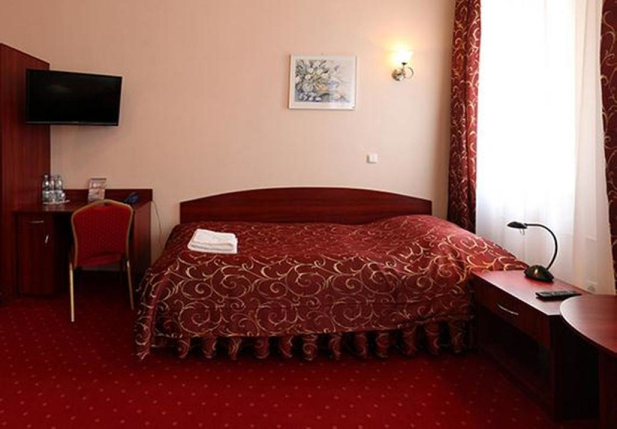 Светлый номер оформлен в классическом стиле в теплых тонах и обставлен деревянной мебелью