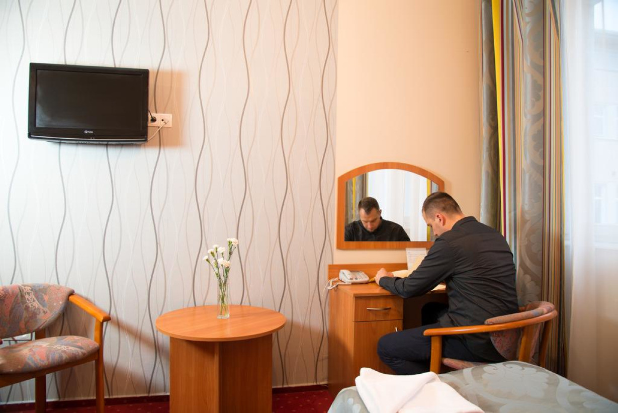 Светлый номер с классическим дизайном в теплых тонах. В числе удобств телевизор со спутниковыми каналами, а также ванная комната с душем и бесплатными туалетно-косметическими принадлежностями