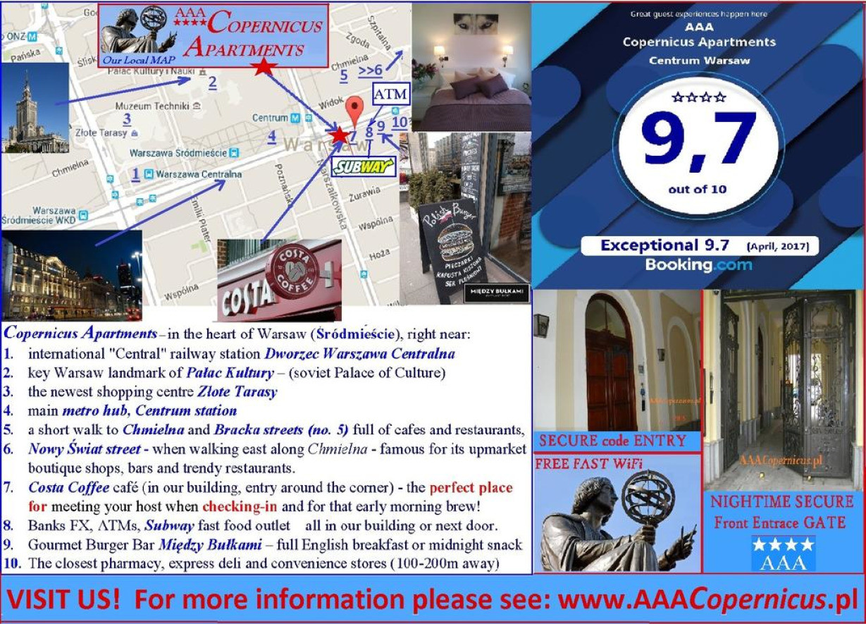 Апартаменты Aaacopernicus Centrum с собственной кухней и бесплатным Wi-Fi расположены в Варшаве, в 500 м от Дворца культуры и науки. Из окон открывается вид на город. Кроме того, в распоряжении гостей бесплатный мини-бар и эспрессо-машина Tascoma.В числе удобств мини-кухня с посудомоечной машиной, микроволновой печью и чайником, телевизор с плоским экраном и собственная ванная комната с душем.Улица Новый Свят и Парадная площадь находятся в 500 м от апартаментов Aaacopernicus Centrum. Расстояние до варшавского аэропорта имени Фредерика Шопена составляет 7 км.