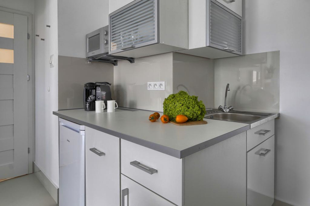 Апартаменты с микроволновой печью и кухонными принадлежностями. Пол выложен плиткой/мрамором