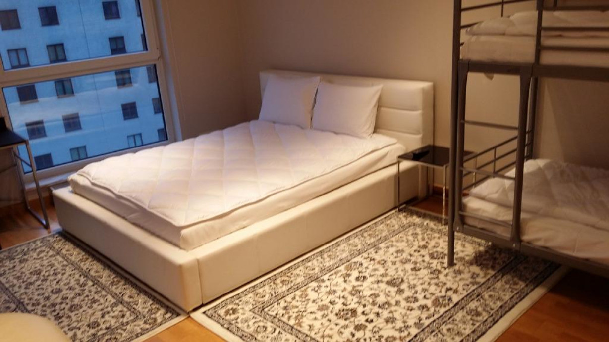 1 очень большая двуспальная кровать и 1 двухъярусная кровать