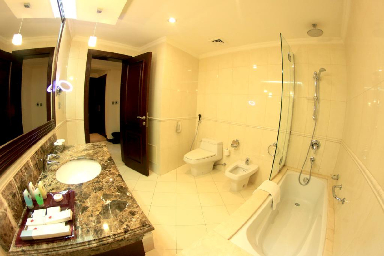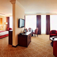 Номер на верхнем этаже с видом на Доху. Имеется гостиная с современным декором, кофемашина Nespresso, а также телевизор с плоским экраном и спутниковыми каналами