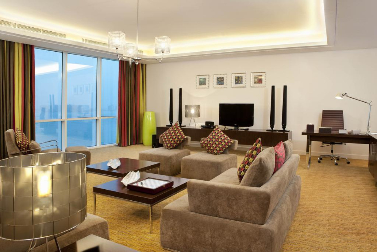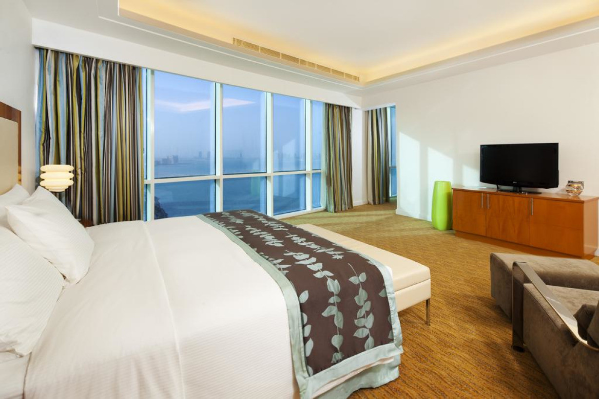 Просторный люкс с 1 кроватью размера «king-size» и диваном идеально подходит для семей. С собственного балкона открывается панорамный вид. Из французских окон отдельной просторной гостиной открывается частичный вид на море. Гостям предоставляется право посещения представительского лаунджа на 23 этаже, где сервируется бесплатный завтрак и подаются вечерние напитки. Среди прочих удобств — большой стол и Wi-Fi. В отделанной мрамором ванной комнате предоставляются мягкие халаты. Кроме того, в распоряжении гостей ЖК-телевизор. В номере могут разместиться 2 взрослых и 2 детей