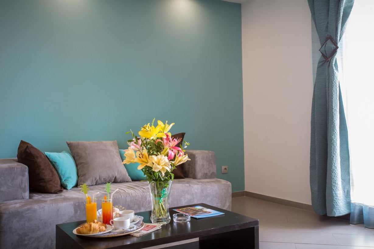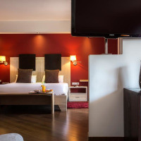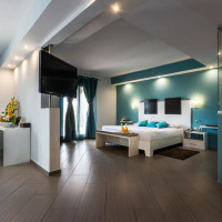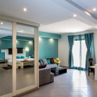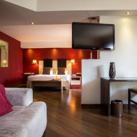 Просторный номер с современным интерьером. В числе удобств — кондиционер, гостиная зона, телевизор со спутниковыми каналами, телефон и ванная комната с душем