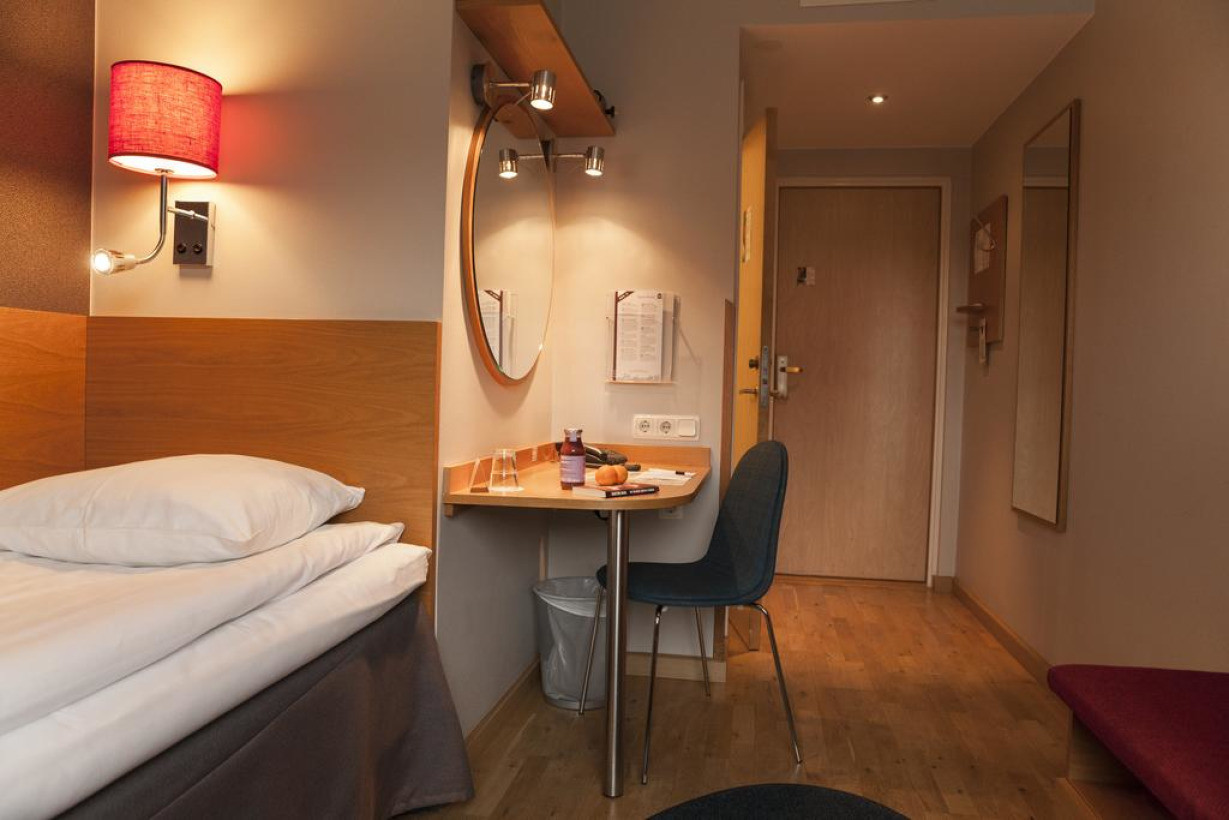 Небольшой номер с кроватью шириной 140 см, кабельным телевидением, письменным столом и ванной комнатой с душем. Пожалуйста, обратите внимание, что в номерах данной категории установка дополнительных кроватей не предусмотрена