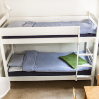 Лаконично меблированный номер с общей ванной комнатой. Обратите внимание, что третья кровать является раскладной