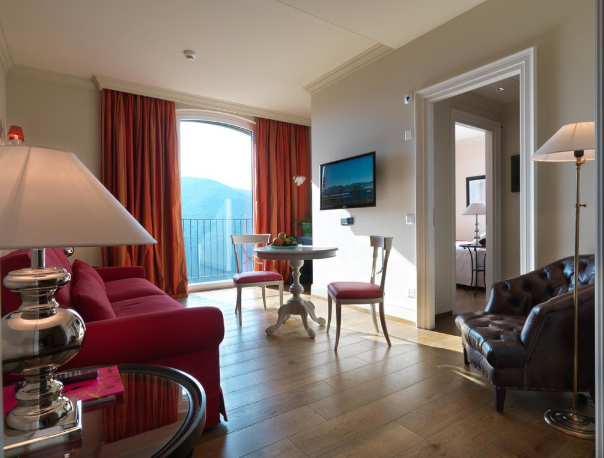 Просторный люкс с кондиционером, панорамным видом, спальней, гостиной с плоскоэкранным телевизором со 100 спутниковыми каналами, электрическим чайником, мини-кухней и большой ванной комнатой с халатами, тапочками, а также многофункциональной душевой насадкой. В числе прочих удобств выбор подушек и минеральная вода. Предоставляется возможность бесплатного посещения спа-центра