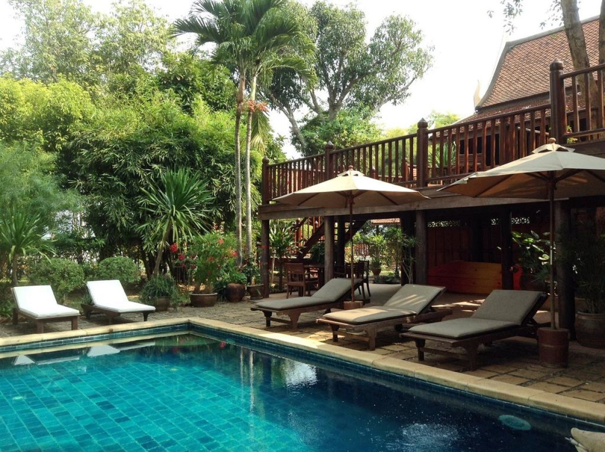 Просторная вилла с собственным бассейном, кондиционером, гостиным уголком, обеденным столом и террасой с видом на реку