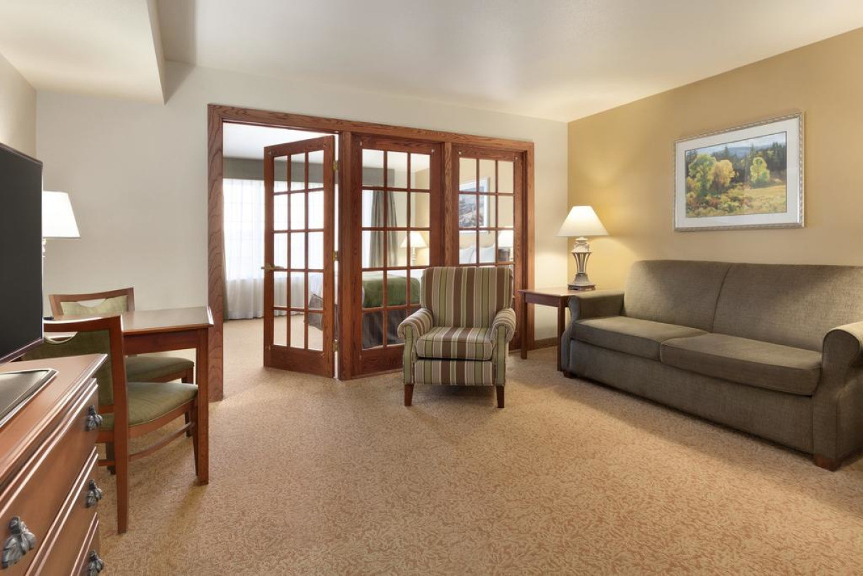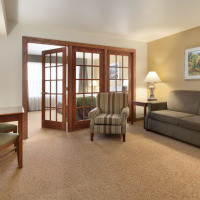 В этом просторном люксе установлен телевизор с плоским экраном и кабельными каналами. Также к вашим услугам гостиный уголок, обеденная зона, микроволновая печь и небольшой холодильник