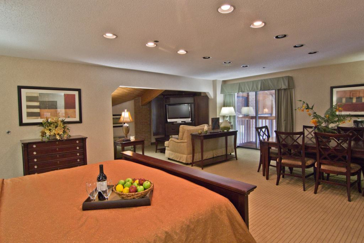 Люкс с балконом с видом на бассейн, а также обеденным столом и гидромассажной ванной. Имеется также микроволновая печь и кафельный/мраморный пол