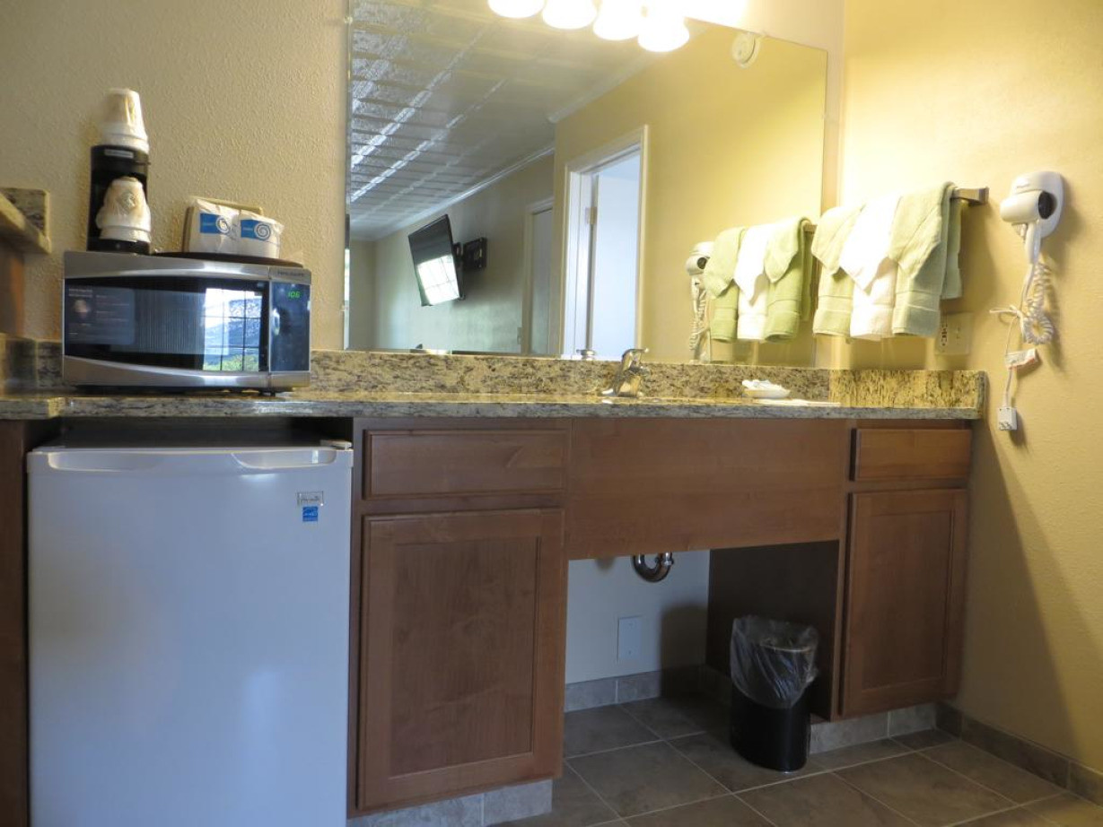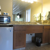 Небольшой люкс с телевизором с 50-дюймовым плоским экраном, гранитными столешницами и шкафчиками, выполненными по индивидуальному заказу. В числе удобств фен, микроволновая печь и холодильник. Проживание с домашними животными не разрешено