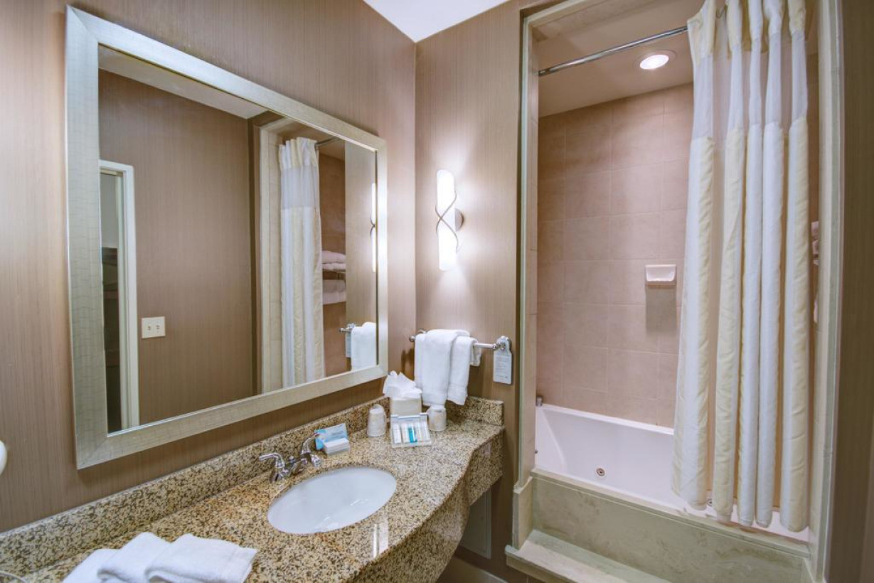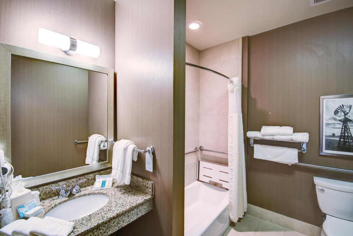 В этом номере имеется ванна с поручнями и примыкающим сиденьем для гостей с ограниченными физическими возможностями, а также низкий туалетный столик в ванной комнате и низкая полка во встроенном шкафу. Установлено эргономичное кресло. По 36-дюймовому телевизору с высокой четкостью изображения можно посмотреть фильм или любимое шоу. В номере также есть микроволновая печь, холодильник и принадлежности для чая/кофе. Среди удобств большой рабочий стол, два телефона и бесплатный проводной и беспроводной доступ в Интернет. Фактически предоставляемые номера для гостей с ограниченными физическими возможностями могут отличаться интерьером и другими особенностями от номеров на фотографиях