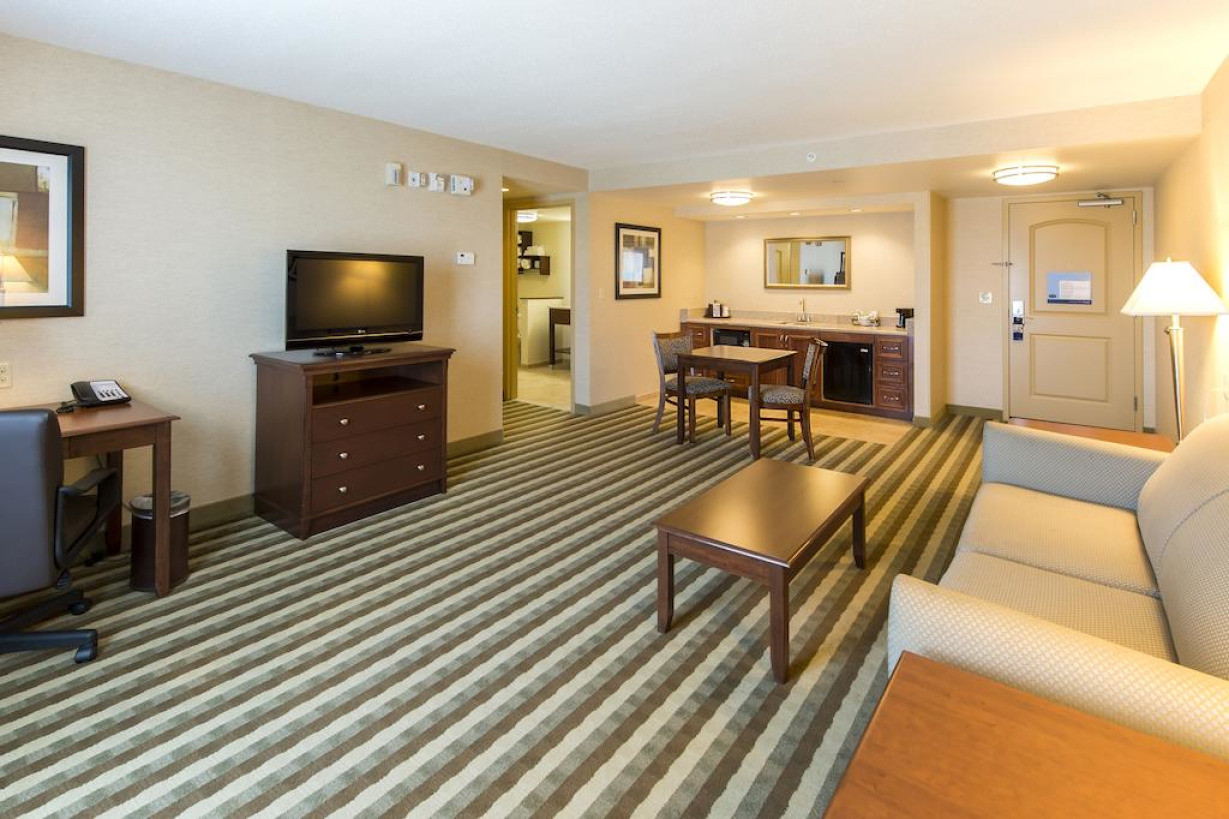 В этом номере имеются ЖК-телевизор с плоским экраном, кофеварка и рабочий стол