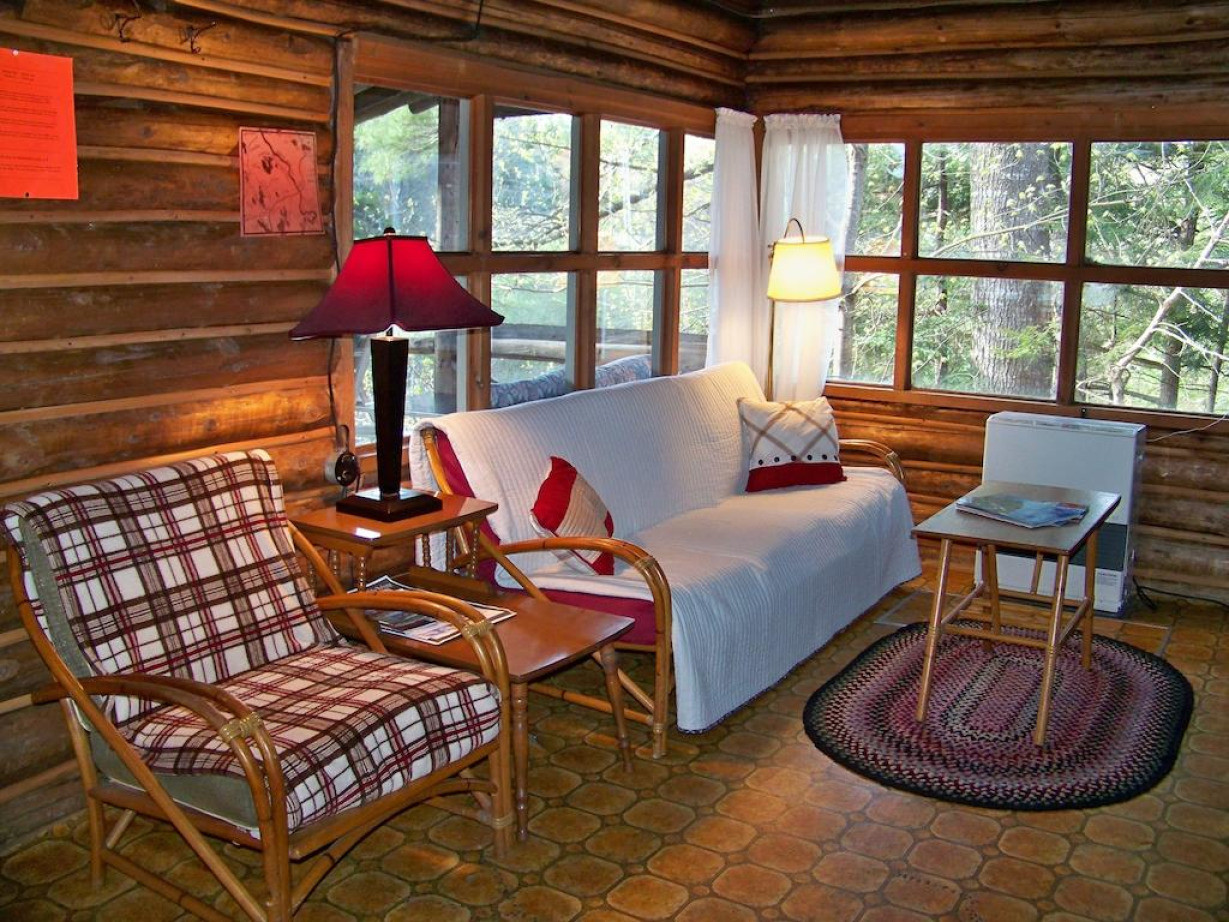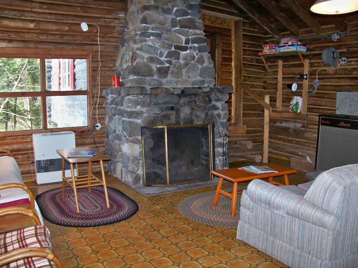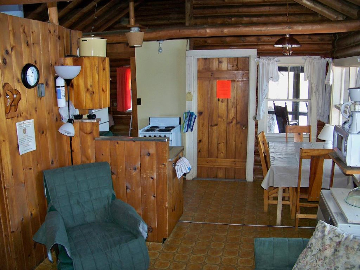 В построенном в 1945 году и расширенном в начале 50-х годов одноэтажном коттедже для отопления используются дровяная печь и облицованный камнем камин. В сарае на открытом воздухе приготовлены бесплатные дрова. В коттедже есть полностью оборудованная кухня, гостиная, обеденная зона и ванная комната с душем, в каждой из 2 спален установлены 2 односпальные кровати. Гостям предоставляются полотенца и постельное белье. Среди прочих удобств — застекленное крыльцо с видом на реку в районе речных порогов, угольный мангал и стол для пикника на открытом воздухе. Обратите внимание, что в этом коттедже нет Wi-Fi