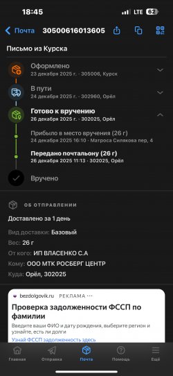 ЕленаОтвратительная работа почтальонов в этом отделении . По отслеживанию трека - заказное письмо забрал почтальон в 11.15, но по факту в этот день адресату не доставил( это важные документы, которые сегод.. Читать дальше