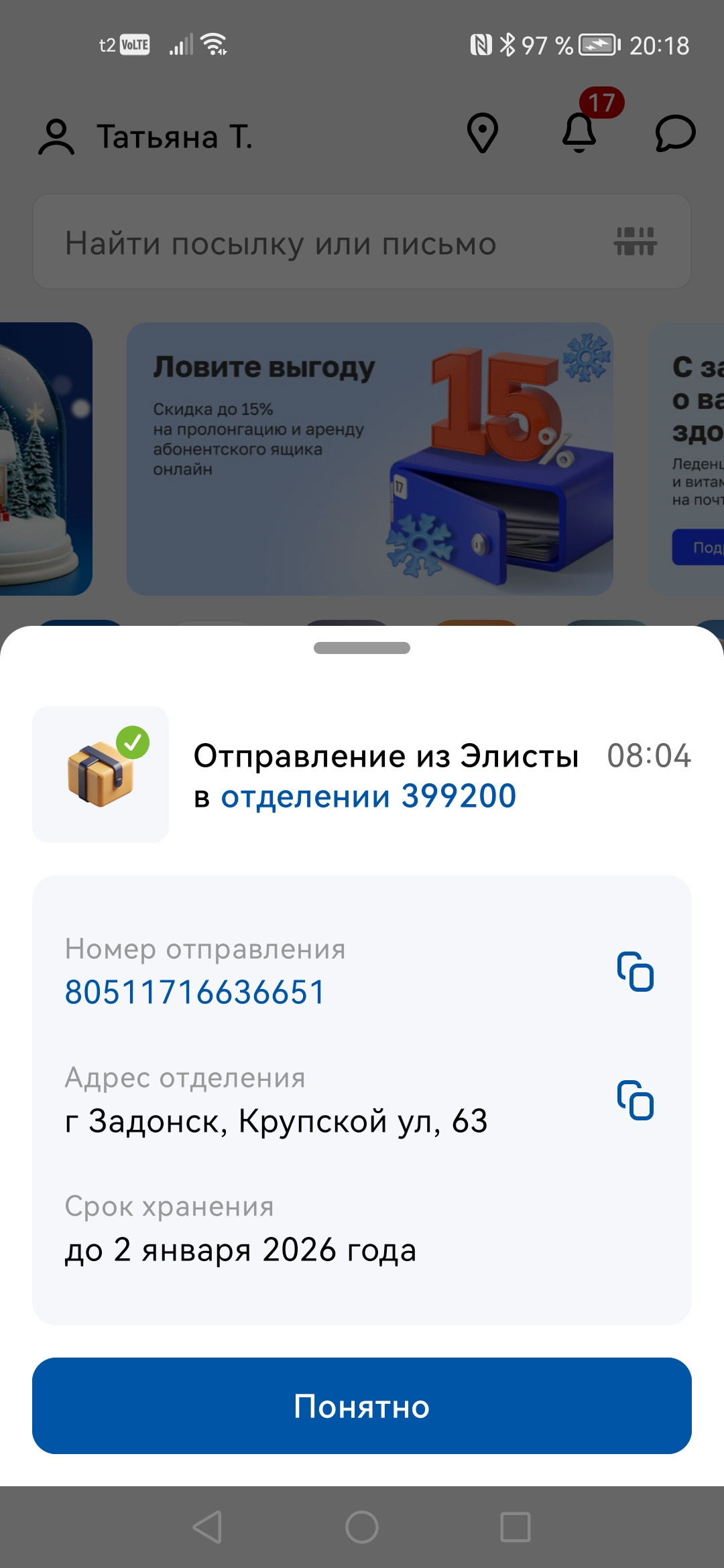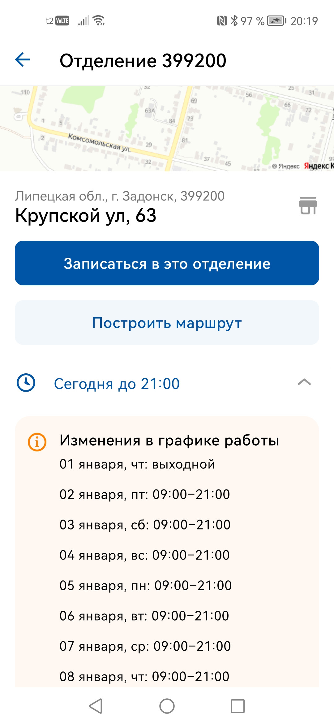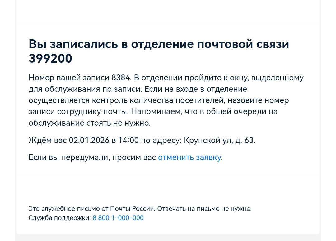 Рекомендуем уточнить режим работы почты, позвонив по номеру +7 474 712-18-48